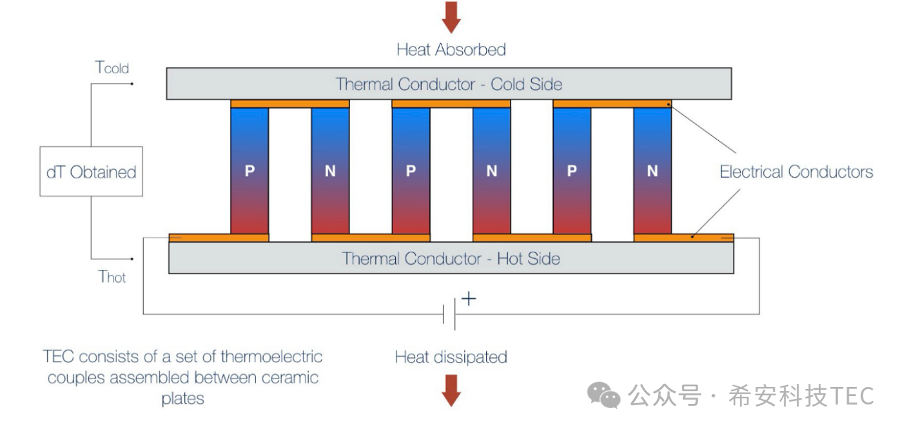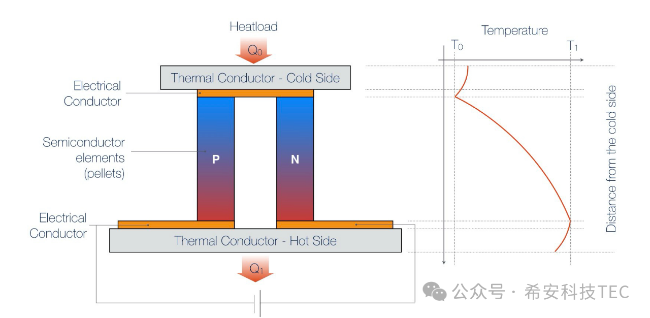 Konduktor terma ditambah pada kedua-dua hujung termokopel seperti yang ditunjukkan dalam rajah berikut: TEC lengkap terbentuk. Apabila TEC dikuasakan, permukaan atas akan menyerap haba, yang dipanggil hujung sejuk, dan haba yang diserap ialah Q0. Permukaan bawah membebaskan haba dan dipanggil permukaan panas, dengan haba yang dibebaskan ialah Q1 ; Q1= Q0+Qtec